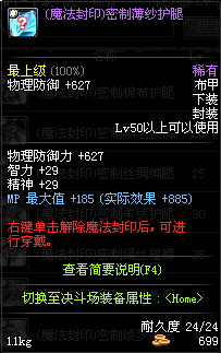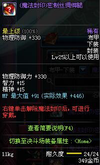 | 25 | (魔法封印)密制丝绸绑腿 | *Lv24~31普通地下城怪物掉落 *在NPC阿尔伯特·伯恩斯坦的物品店购买 *完成[石像的媒介物]任务 *使用Lv24~31怪物掉落的设计图进行制作 |