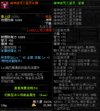 | 85 | 海神谜咒之蓝灵长裤 | *昨日之巴斯顿 掉落 (在远古地下城里出没。) *从NPC鲁特的物品店出售的[海神谜咒防具礼盒]中获得 *船长鲁特 出售 (深海诅咒 : 解咒法×600) |