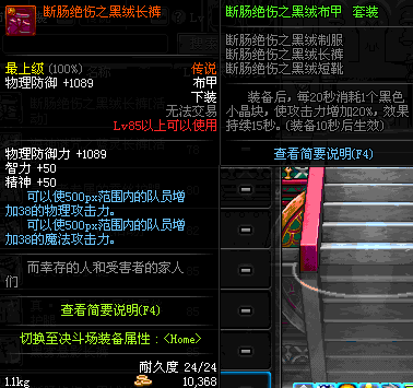 | 85 | 断肠绝伤之黑绒长裤 | *昨日之巴斯顿 掉落 (在远古地下城里出没。) *从NPC鲁特的物品店出售的[断肠绝伤防具礼盒]中获得 *任务奖励(地下城:比尔马克帝国试验场 NPC娜塔莉娅·休勒) |