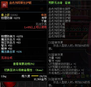 | 85 | 血色残阳青丝护腿 | *昨日之巴斯顿 掉落 (在远古地下城里出没。) *从NPC鲁特的物品店出售的[血色残阳防具礼盒]中获得 |