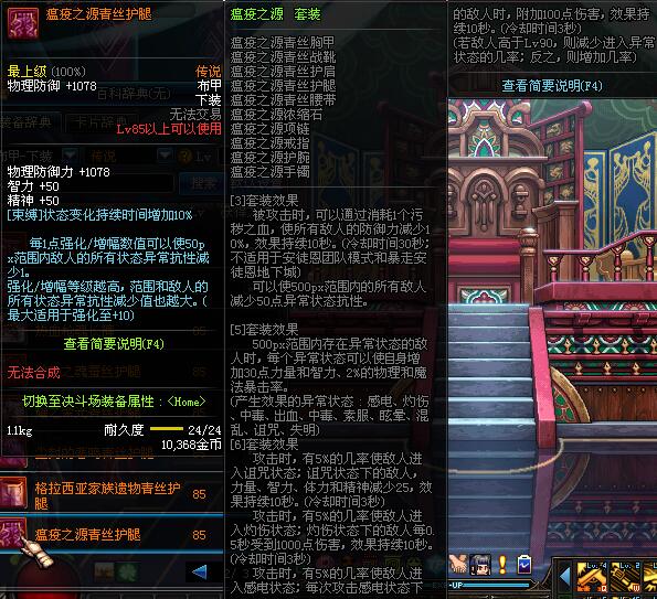 | 85 | 瘟疫之源青丝护腿 | *昨日之巴斯顿 掉落 (在远古地下城里出没。) *从NPC鲁特的物品店出售的[瘟疫之源防具礼盒]中获得 |