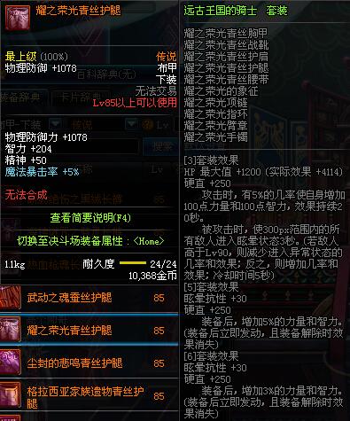 | 85 | 耀之荣光青丝护腿 | *昨日之巴斯顿 掉落 (在远古地下城里出没。) *从NPC鲁特的物品店出售的[耀之荣光防具礼盒]中获得 |