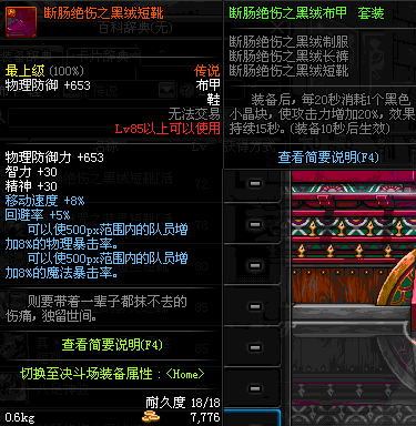 | 85 | 断肠绝伤之黑绒短靴 | *昨日之巴斯顿 掉落 (在远古地下城里出没。) *从NPC鲁特的物品店出售的[断肠绝伤防具礼盒]中获得 *任务奖励(地下城:比尔马克帝国试验场 NPC娜塔莉娅·休勒) |