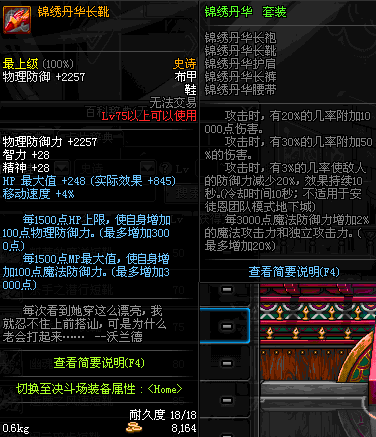 | 75 | 锦绣丹华长靴 | *Lv74~81深渊地下城怪物掉落 | 锦绣丹华 套装 | |