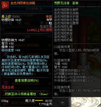 | 85 | 血色残阳青丝战靴 | *昨日之巴斯顿 掉落 (在远古地下城里出没。) *从NPC鲁特的物品店出售的[血色残阳防具礼盒]中获得 |