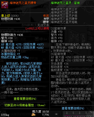 | 85 | 海神谜咒之蓝灵腰带 | *昨日之巴斯顿 掉落 (在远古地下城里出没。) *从NPC鲁特的物品店出售的[海神谜咒防具礼盒]中获得 *船长鲁特 出售 (深海诅咒 : 解咒法×600) |