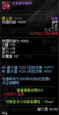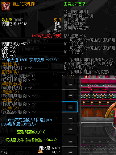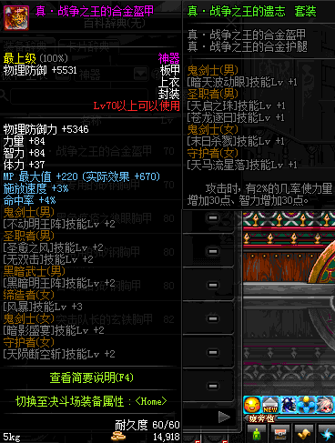 | 70 | 真 · 战争之王的合金盔甲 | *设计图(70LV以上普通地下城 登场的NPC加百利 出售) *战争之王的合金盔甲 → 用远古神器装备进化书升级(NPC船长鲁特 出售) |