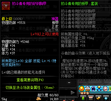 | 70 | 初斗者专用的矽钢胸甲 | *决斗场-爱莎&鹰吉&风铃 出售 | 初斗者专用的 套装 | |