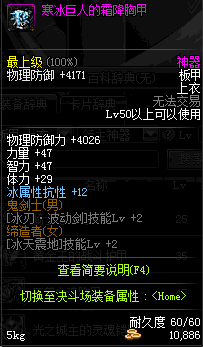 | 50 | 寒冰巨人的霜降胸甲 | *寒冰巨人利库 掉落(黑色雪山) *在NPC敏泰的物品店购买(阿拉德陨石×174) |
