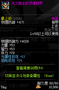 | 50 | 光之城主的灵魂铠甲 | *领主-光之城主赛格哈特 掉落(极光幻境) *在NPC敏泰的物品店购买(阿拉德陨石×174) |
