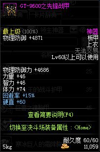 | 60 | GT-9600之先锋战甲 | *GT-9600 掉落(根特南门) **在NPC泽丁·施奈德的物品店购买(黑色陨石×229) |
