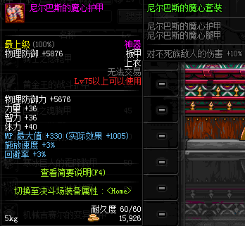 | 75 | 尼尔巴斯的魔心护甲 | *尼尔巴斯·格拉西亚 掉落(暗黑圣战) *在NPC西岚的物品店购买(银色陨石×312) |
