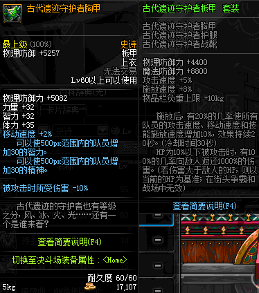 | 60 | 古代遗迹守护者胸甲 | *在NPC歌兰蒂斯·格拉西亚的物品店购买 | 古代遗迹守护者 套装 | |