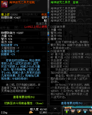 | 85 | 海神谜咒之异灵短靴 | *昨日之巴斯顿 掉落 (在远古地下城里出没。) *从NPC鲁特的物品店出售的[海神谜咒防具礼盒]中获得 *船长鲁特 出售 (深海诅咒 : 解咒法×600) |