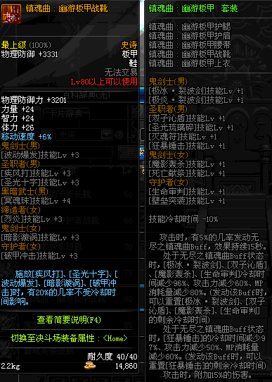 | 80 | 镇魂曲:幽游板甲战靴 | *Lv79~86深渊地下城怪物掉落 | 镇魂曲 : 幽游板甲 套装 | |