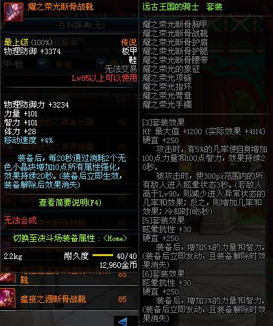 | 85 | 耀之荣光断骨战靴 | *昨日之巴斯顿 掉落 (在远古地下城里出没。) *从NPC鲁特的物品店出售的[耀之荣光防具礼盒]中获得 |