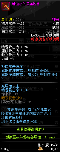 | 35 | 维迪尔的黄金匕首 | *黄金王维迪尔 掉落(黄金矿洞) *在NPC克伦特的物品店购买(阿拉德陨石 ×150) |