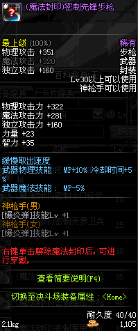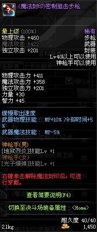 | 40 | (魔法封印)密制狙击步枪 | *Lv39~46普通地下城怪物掉落 *完成[变异的美神恩泽]任务 *使用Lv39~46怪物掉落的设计图进行制作 |