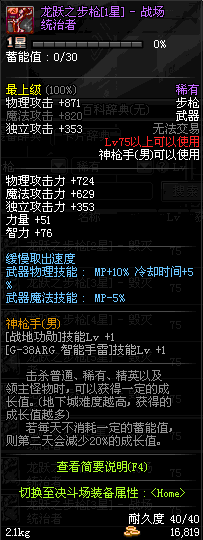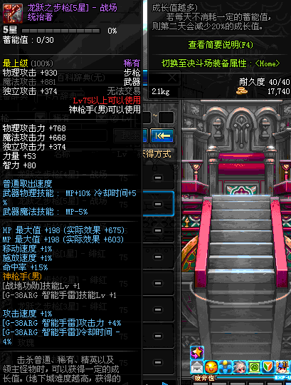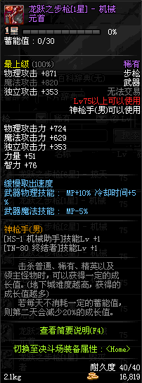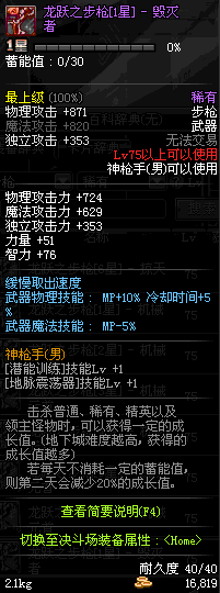 | 75 | 龙跃之步枪[1星] – 毁灭者 | *完成二次觉醒任务后可以从NPC小铁柱处获得此道具。 | ||