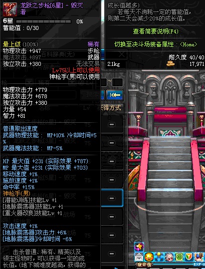 | 75 | 龙跃之步枪[6星] – 毁灭者 | *完成二次觉醒任务后可以从NPC小铁柱处获得此道具。 | ||