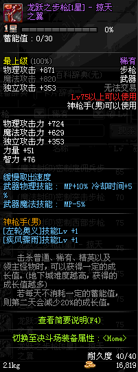 | 75 | 龙跃之步枪[1星] – 掠天之翼 | *完成二次觉醒任务后可以从NPC小铁柱处获得此道具。 | ||