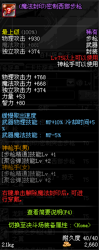 | 75 | (魔法封印)密制西部步枪 | *Lv75~81普通地下城怪物掉落 *完成[调查紫雾团]任务 *使用Lv75~81怪物掉落的设计图进行制作 |