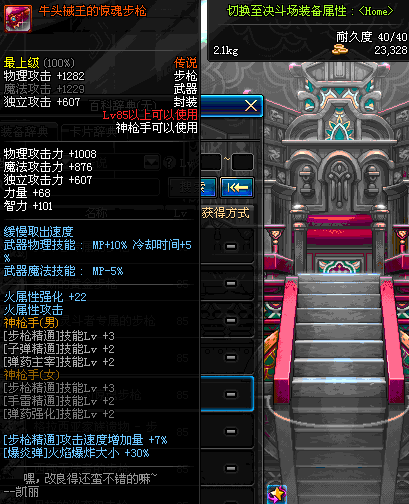 | 85 | 牛头械王的惊魂步枪 | *牛头械王 掉落(地下城: 比尔马克帝国试验场 6图) *设计图(地下城 比尔马克帝国试验场 登场的NPC加百利 出售) |