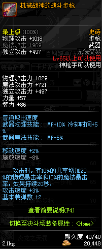 | 65 | 机械战神的战斗步枪 | *Lv64~71深渊地下城怪物掉落 *在NPC沉默之克雷娅的物品店购买 |