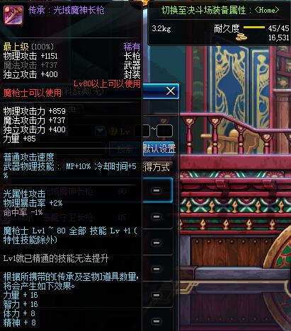 | 50 | 精铸的炫光长枪 | *领主-光之城主赛格哈特 掉落(极光幻境) *在NPC敏泰的物品店购买(阿拉德陨石×285) |