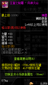 | 鬼剑士 | 神枪手 | 格斗家 | 魔法师 | 圣职者 | 暗夜使者 | 布甲 | 皮甲 | 重甲 | 轻甲 | 板甲 | 饰品 |