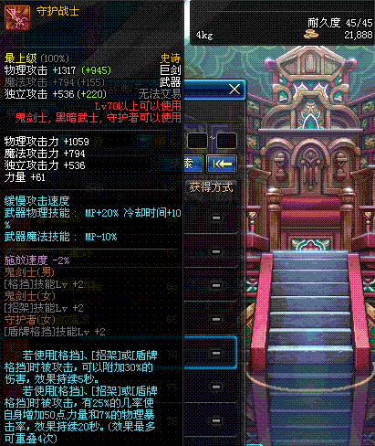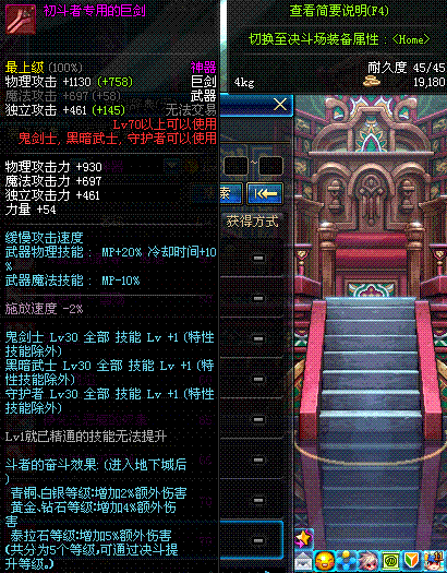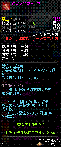 | 45 | 萨乌塔的兽角巨剑 | *牛头王萨乌塔 掉落(地下城:冰刺庭院) *在NPC敏泰的物品店购买(阿拉德陨石×240) |