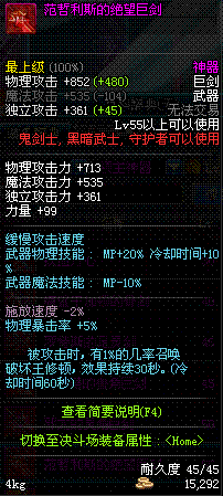| 55 | 范哲利斯的绝望巨剑 | *范哲利斯 掉落(地下城: 无尽的噩梦) *在NPC敏泰的物品店购买(阿拉德陨石×330) |