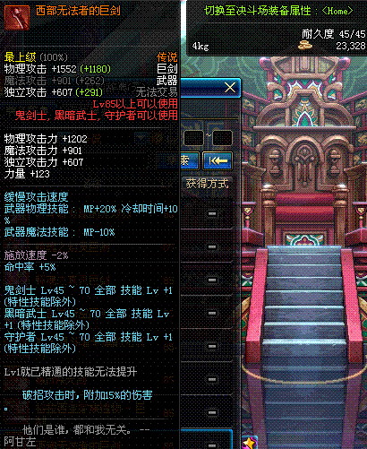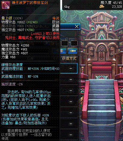 | 45 | 罗特斯的足灵剑 | *长脚罗特斯 掉落(地下城: 罗特斯的宫殿) *伊莎杜拉 出售(阿拉德陨石×240) |