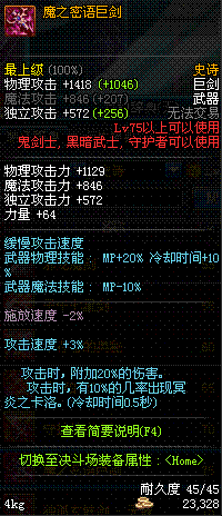 | 75 | 魔之密语巨剑 | *猎人Lee 掉落(在时空之门地区的深渊地下城出没。) | ||