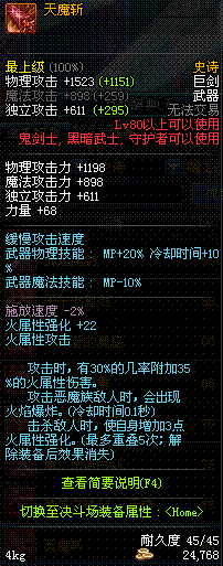 | 80 | 天魔斩 | *Lv79~86深渊地下城怪物掉落 *攻坚队完成安徒恩团队模式的[讨伐安徒恩]任务时,获得的奖励。 |