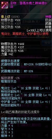 | 30 | 圣物 : 雪魂冰魄之韩瑞德长剑 | *Lv29~36普通地下城怪物掉落 |