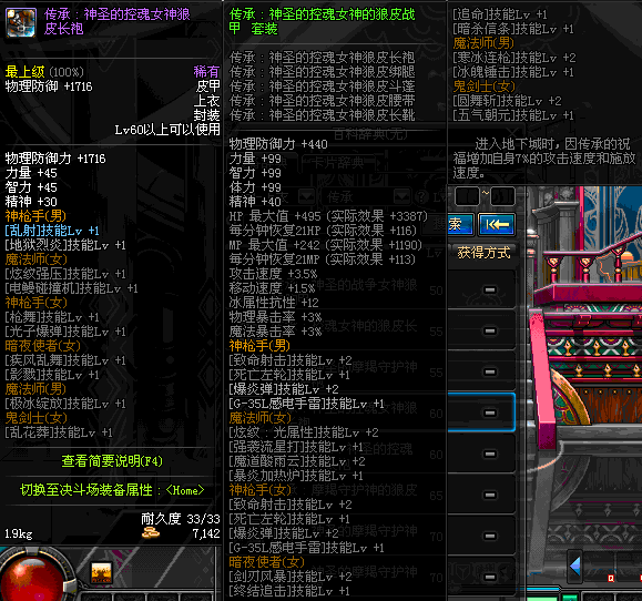 | 鬼剑士 | 神枪手 | 格斗家 | 魔法师 | 圣职者 | 暗夜使者 | 布甲 | 皮甲 | 重甲 | 轻甲 | 板甲 | 饰品 |