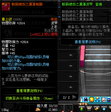 | 85 | 断肠绝伤之黑革制服 | *昨日之巴斯顿 掉落 (在远古地下城里出没。) *从NPC鲁特的物品店出售的[断肠绝伤防具礼盒]中获得 *任务奖励(地下城:比尔马克帝国试验场 NPC娜塔莉娅·休勒) |