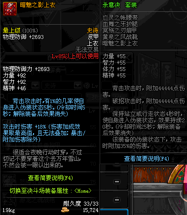 | 85 | 暗魅之影上衣 | *Lv84~91深渊地下城怪物掉落 | 杀意决 套装 | |