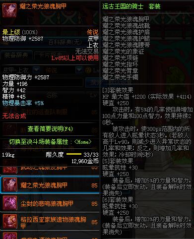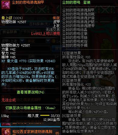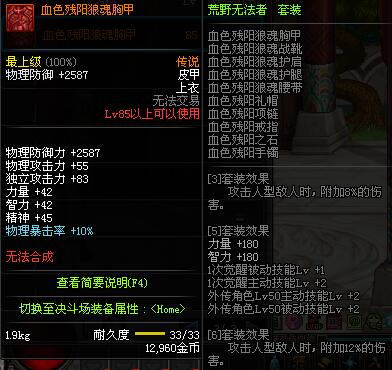 | 85 | 血色残阳狼魂胸甲 | *昨日之巴斯顿 掉落 (在远古地下城里出没。) *从NPC鲁特的物品店出售的[血色残阳防具礼盒]中获得 |