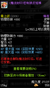 | 15 | (魔法封印)密制皮短裤 | *Lv13~21普通地下城怪物掉落 *完成[魔法封印防具]摩根的研究(2/2)]任务 *使用Lv13~21怪物掉落的设计图进行制作 |