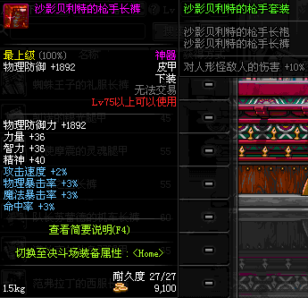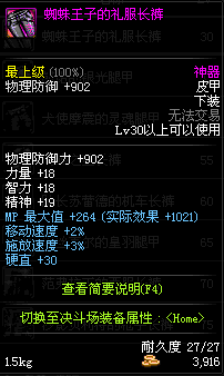 | 30 | 蜘蛛王子的礼服长裤 | *蜘蛛王子尼古拉斯 掉落(蜘蛛王国) *在NPC克伦特的物品店购买(阿拉德陨石×64) |