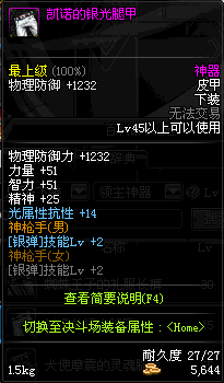 | 45 | 凯诺的银光腿甲 | *落雷凯诺 掉落(冰刺庭院) *在NPC敏泰的物品店购买(阿拉德陨石×147) |