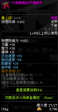 | 55 | 犬使魔震的灵魂腿甲 | *犬使摩震 掉落(噩梦之源) *在NPC敏泰的物品店购买(阿拉德陨石×202) |