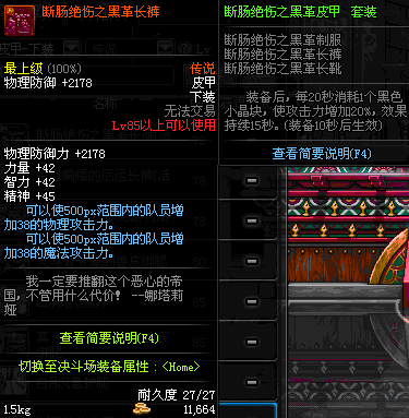 | 85 | 断肠绝伤之黑革长裤 | *昨日之巴斯顿 掉落 (在远古地下城里出没。) *从NPC鲁特的物品店出售的[断肠绝伤防具礼盒]中获得 *任务奖励(地下城:比尔马克帝国试验场 NPC娜塔莉娅·休勒) |