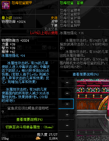 | 75 | 怒海狂鲨腿甲 | *Lv74~81深渊地下城怪物掉落 | 怒海狂鲨 套装 | |