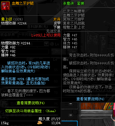 | 85 | 血舞之牙护腿 | *Lv84~91深渊地下城怪物掉落 | 杀意决 套装 | |