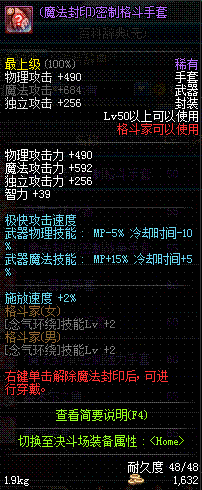 | 50 | (魔法封印)密制格斗手套 | *Lv50~56普通地下城怪物掉落 *完成[黑色噩梦投影出来的世界]任务 *使用Lv50~56怪物掉落的设计图进行制作 |