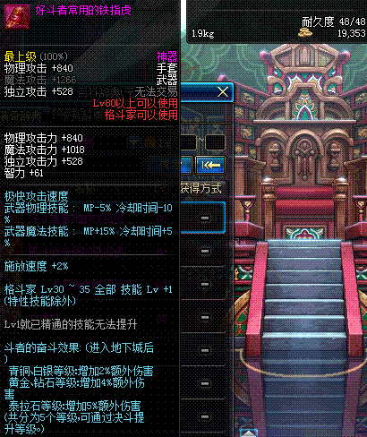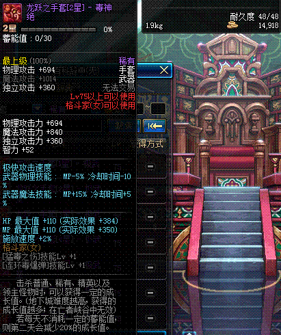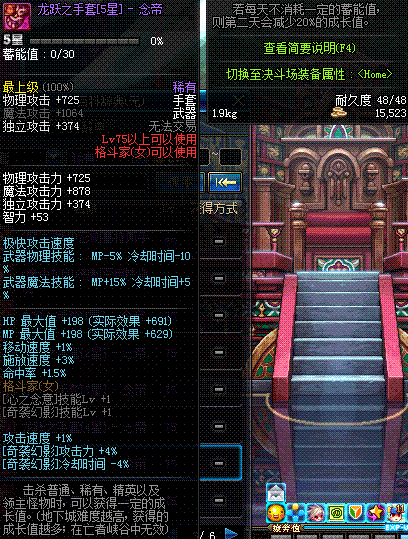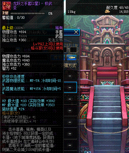 | 75 | 龙跃之手套[3星] - 极武皇 | *完成二次觉醒任务后可以从NPC小铁柱处获得此道具。 | ||