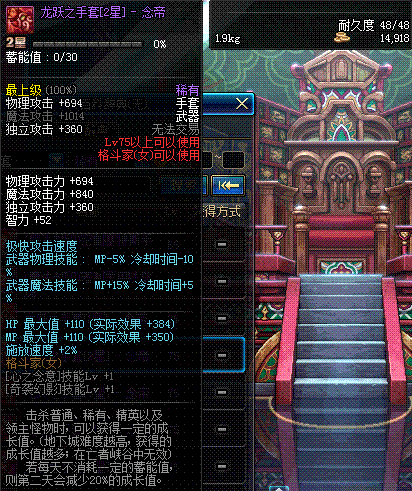 | 75 | 龙跃之手套[2星] - 极武皇 | *完成二次觉醒任务后可以从NPC小铁柱处获得此道具。 | ||
